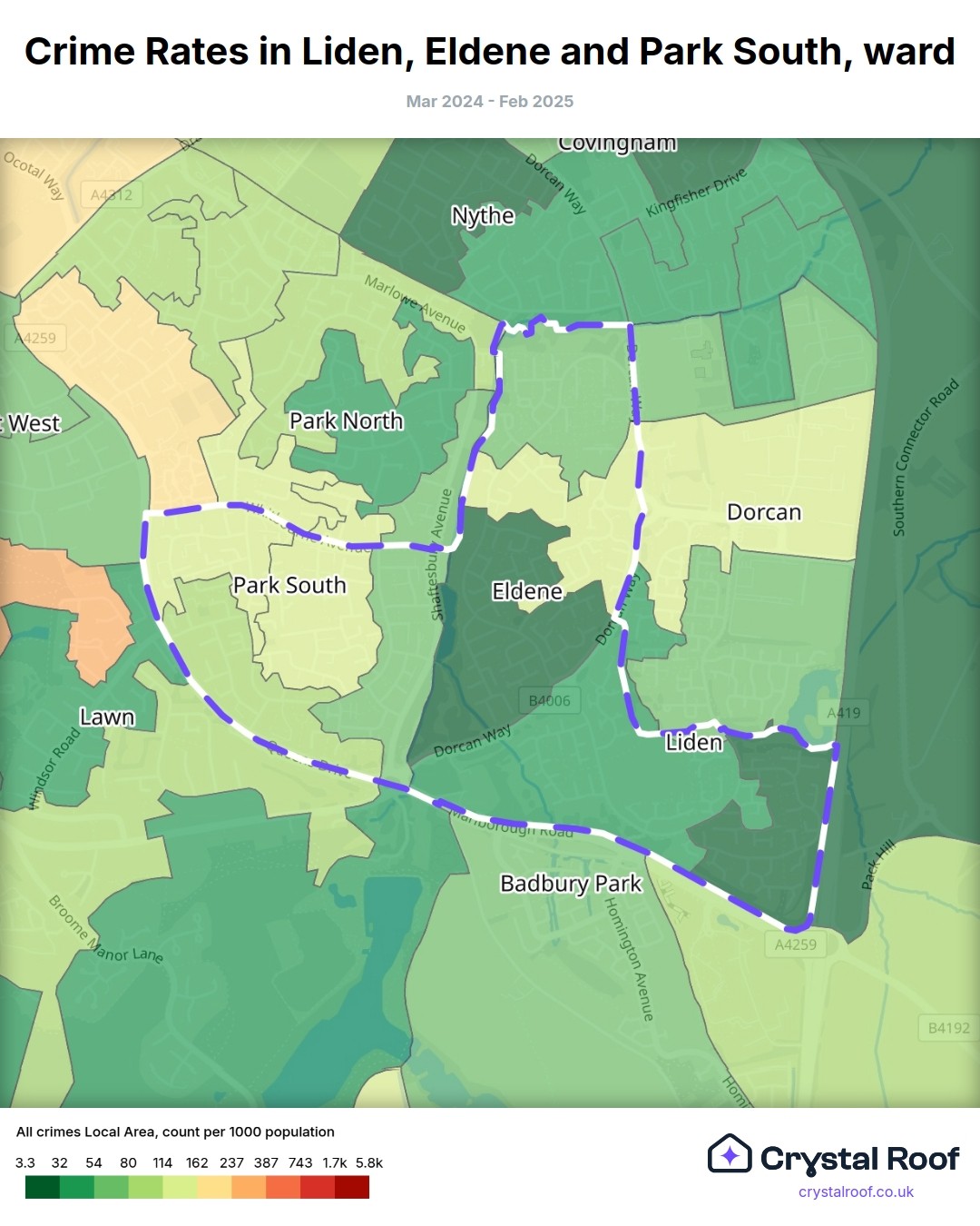 Liden, Eldene and Park South (ward) is located within Swindon (borough). Annual total crime rate in Swindon (borough) is 86.5 crimes per thousand resident population, which can be rated as 4 out of 10 or low crime level compared to other local authority districts in England and Wales.