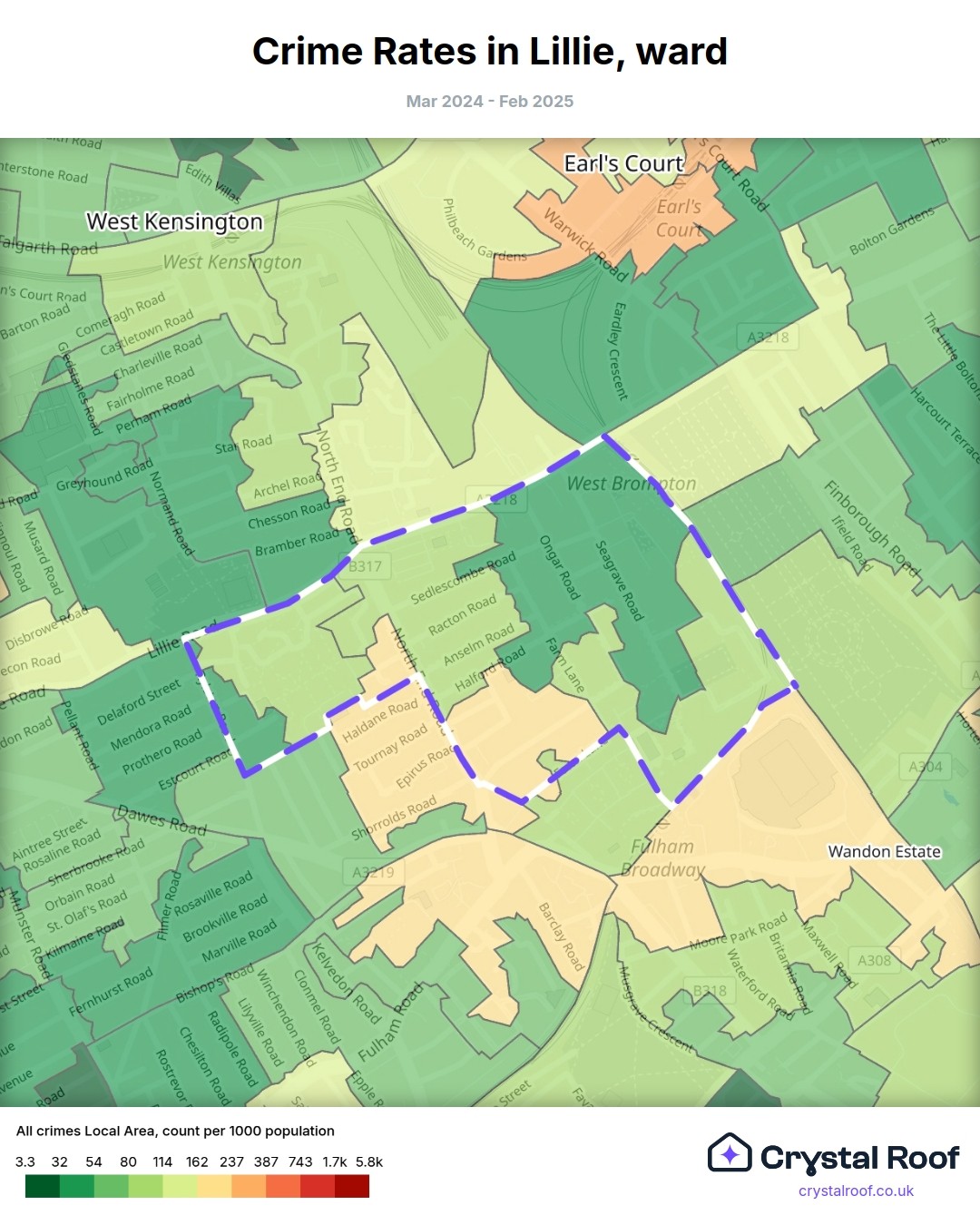 The figures in grey indicate the relative ratings of Lillie (ward) for a specific crime type compared to other wards in England and Wales.