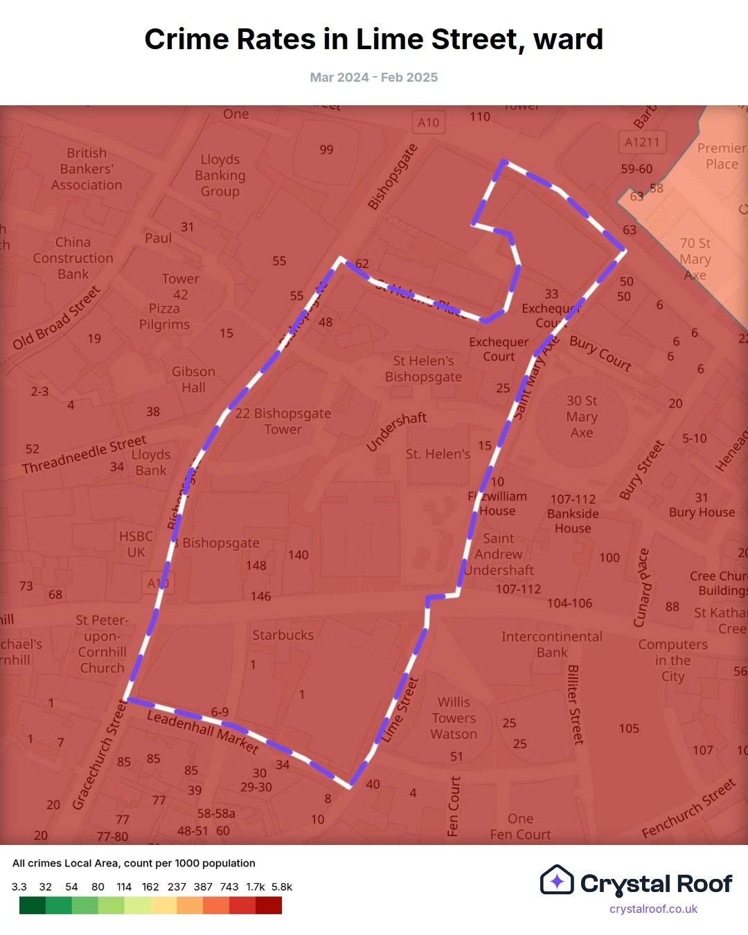 Lime Street (ward) is located within City of London (borough). Annual total crime rate in City of London (borough) is 872 crimes per thousand resident population, which can be rated as 10 out of 10 or high crime level compared to other local authority districts in England and Wales.
