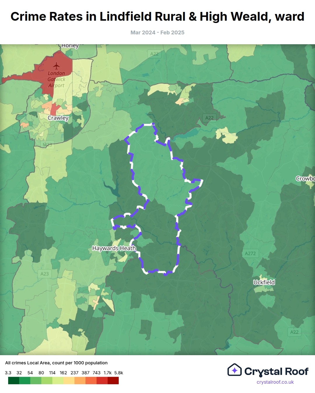 Lindfield Rural & High Weald, (ward) includes areas with the following crime ratings (see map):