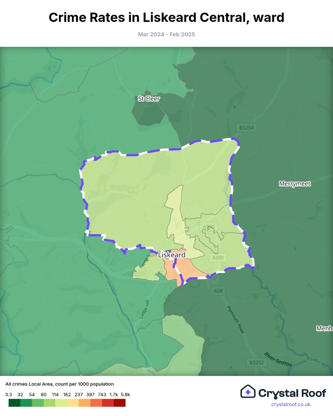 Liskeard Central, (ward) includes areas with the following crime ratings (see map):