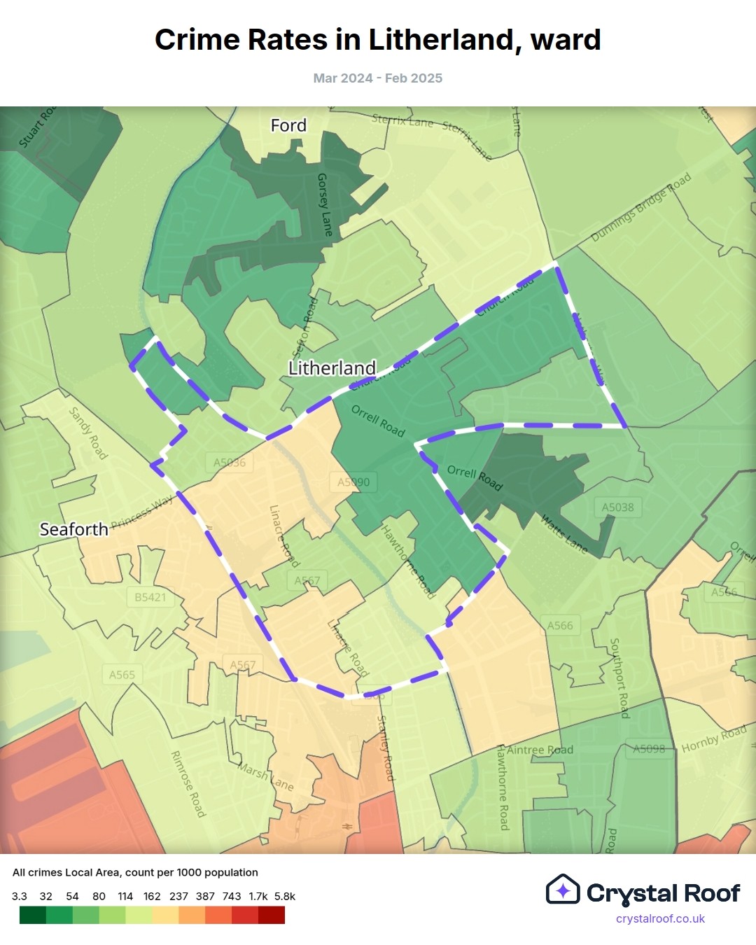 Litherland, (ward) includes areas with the following crime ratings (see map):