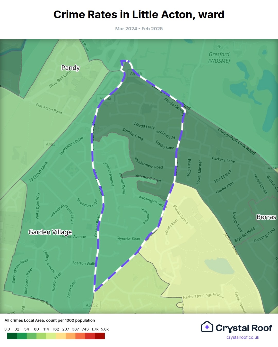Little Acton (ward) is located within Wrexham (borough). Annual total crime rate in Wrexham (borough) is 105 crimes per thousand resident population, which can be rated as 5 out of 10 or medium crime level compared to other local authority districts in England and Wales.