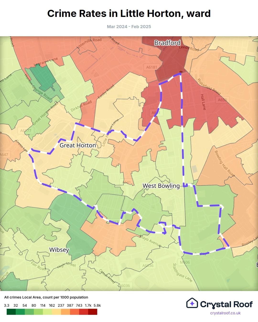 The figures in grey indicate the relative ratings of Little Horton (ward) for a specific crime type compared to other wards in England and Wales.