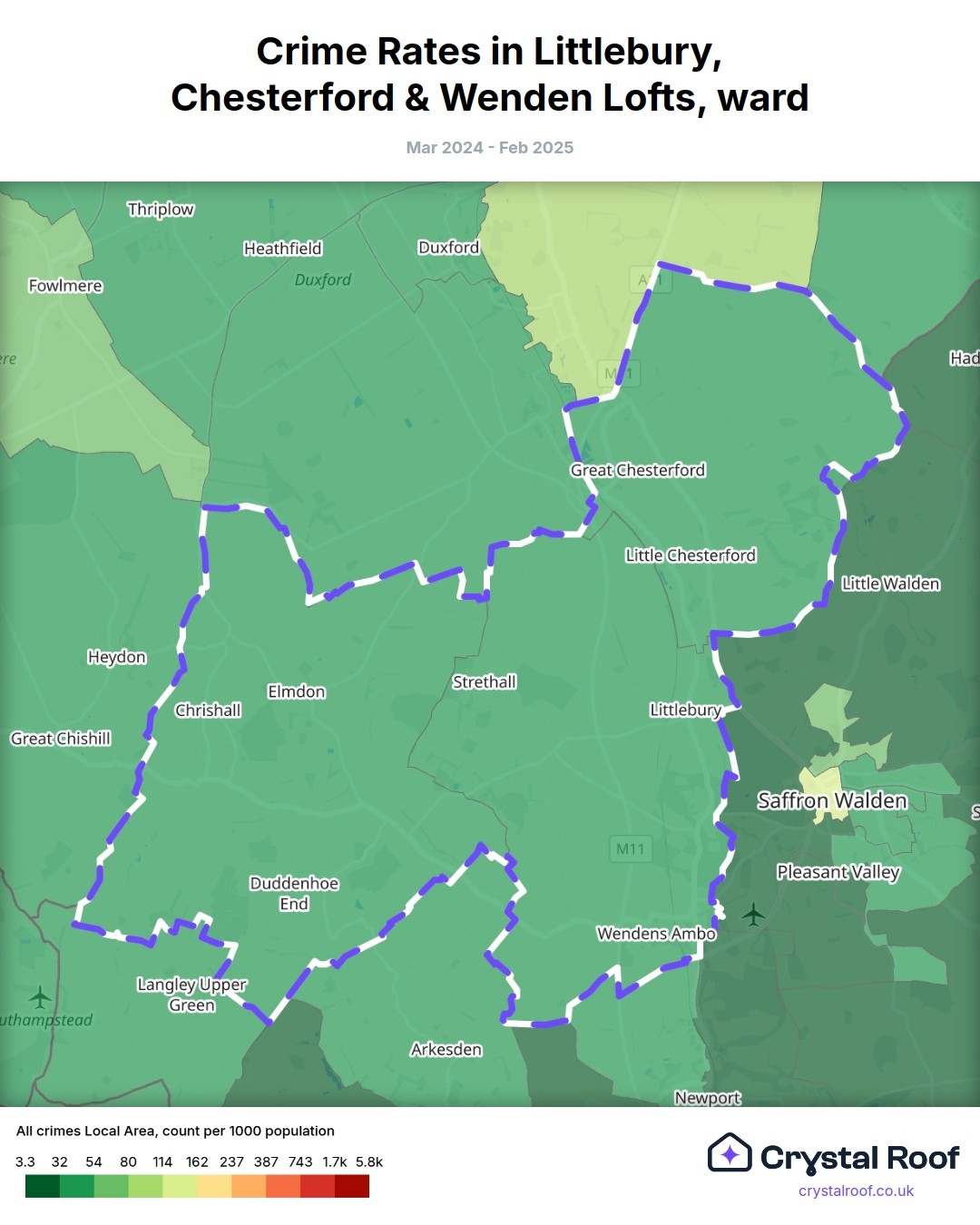 Littlebury, Chesterford & Wenden Lofts, (ward) includes areas with the following crime ratings (see map):