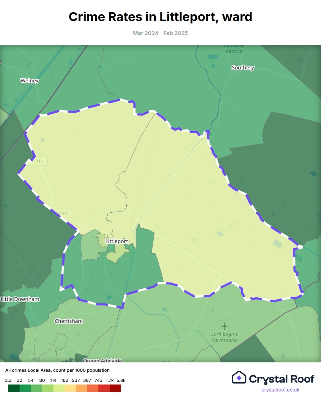 The figures in grey indicate the relative ratings of Littleport (ward) for a specific crime type compared to other wards in England and Wales.