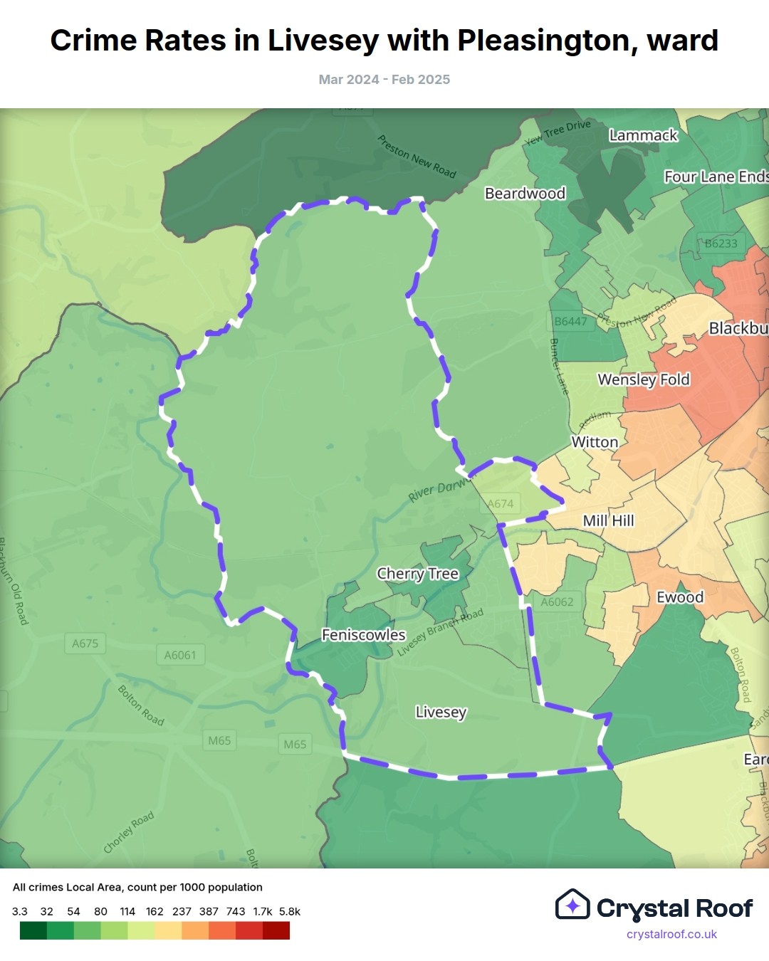 Livesey with Pleasington, (ward) includes areas with the following crime ratings (see map):