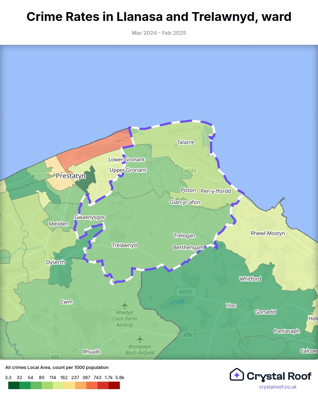 Llanasa and Trelawnyd, (ward) includes areas with the following crime ratings (see map):