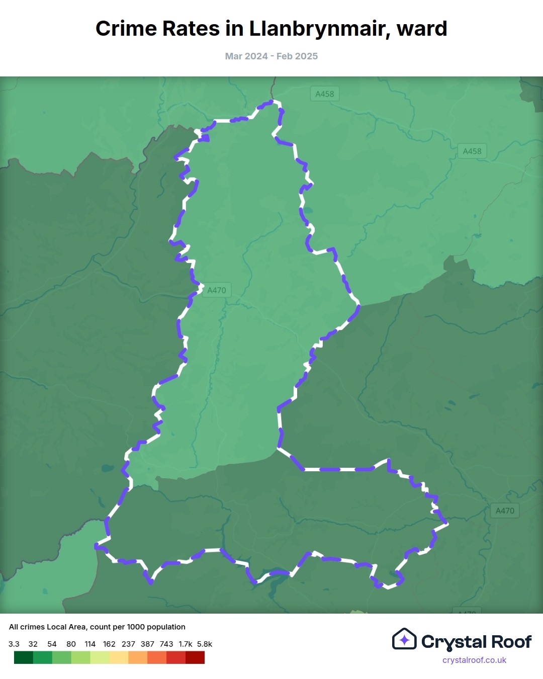 Llanbrynmair, (ward) includes areas with the following crime ratings (see map):