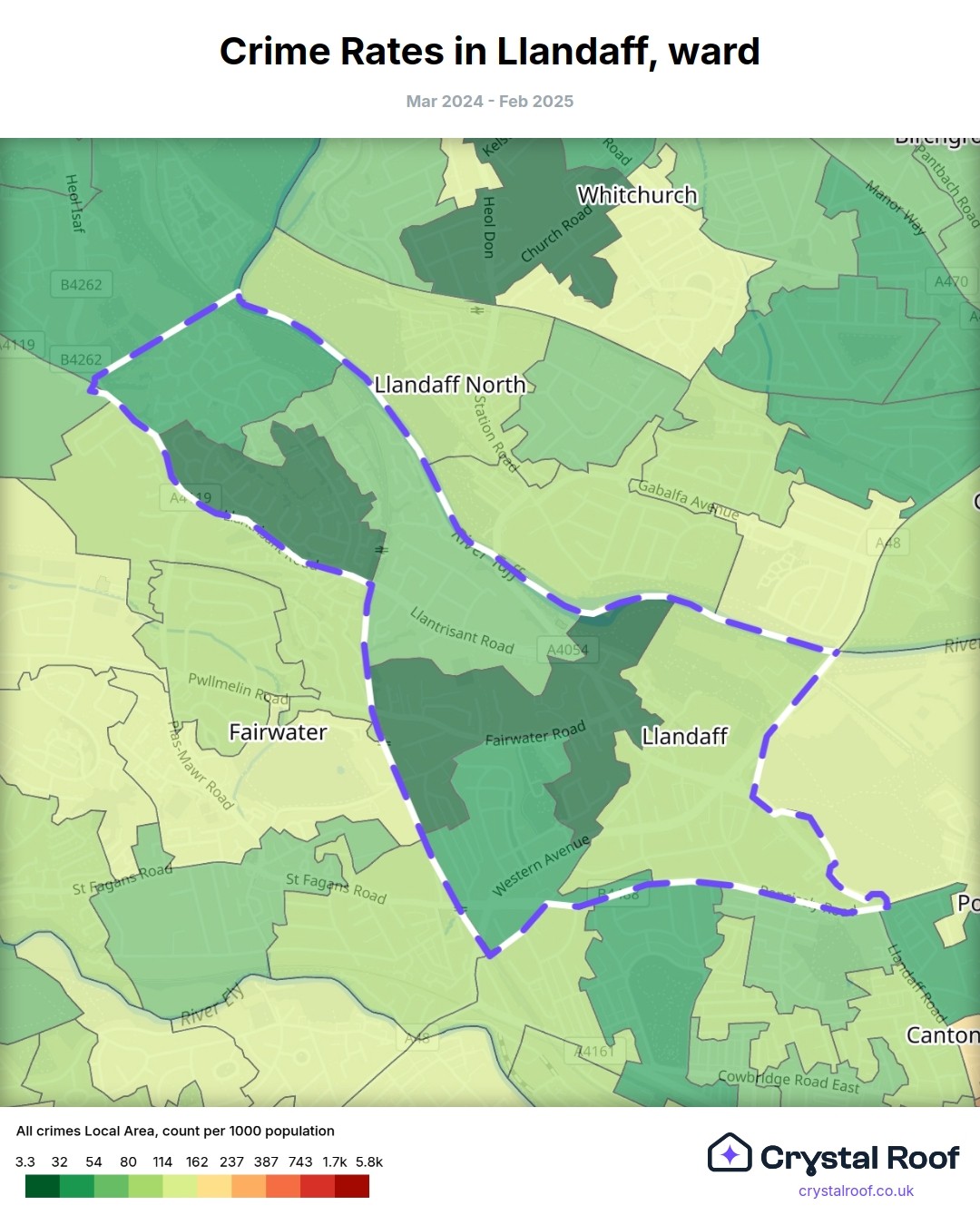 Llandaff, (ward) includes areas with the following crime ratings (see map):