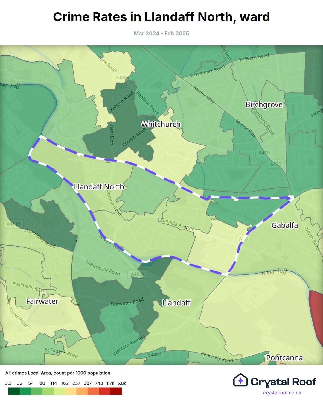 Llandaff North, (ward) includes areas with the following crime ratings (see map):