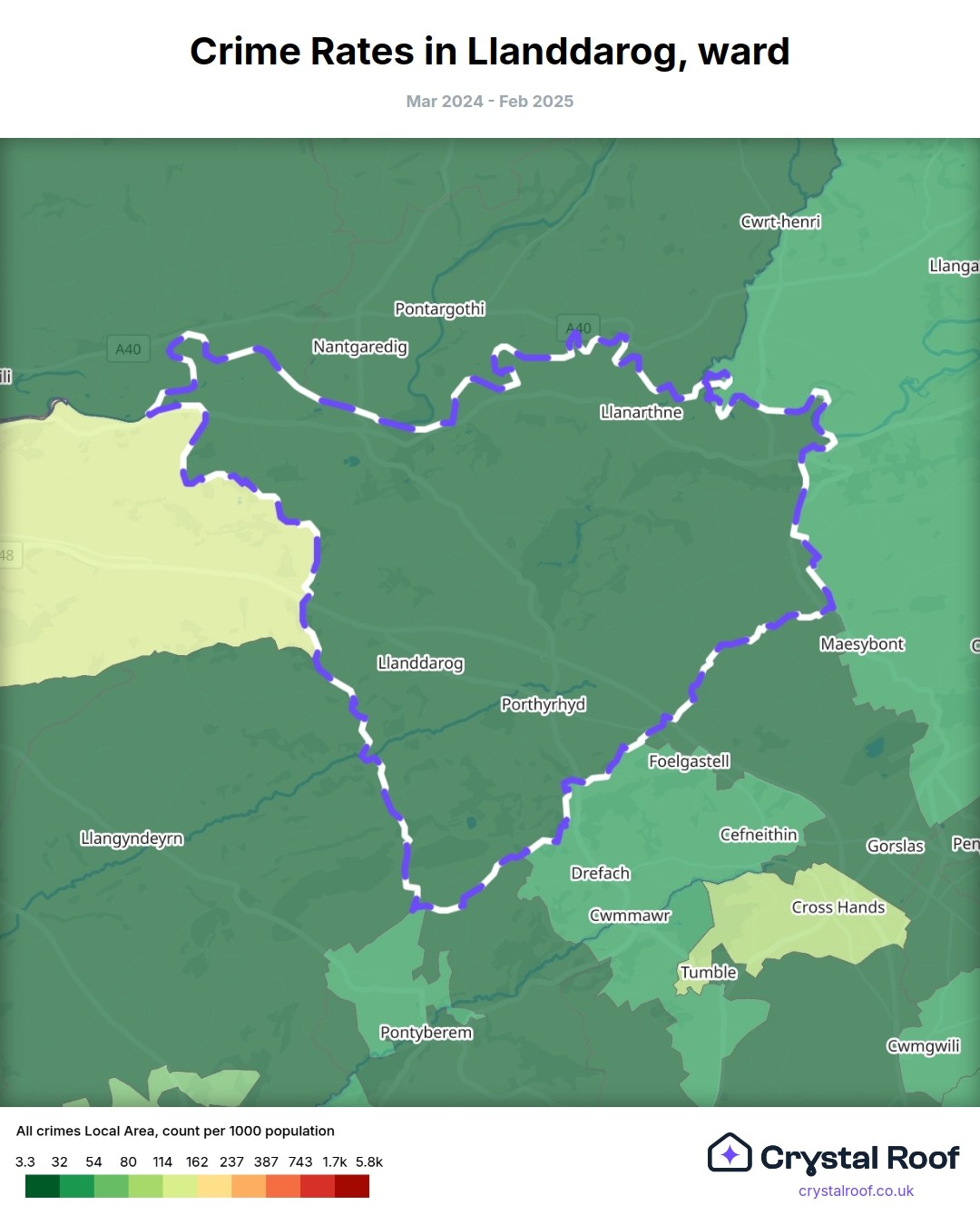 The figures in grey indicate the relative ratings of Llanddarog (ward) for a specific crime type compared to other wards in England and Wales.