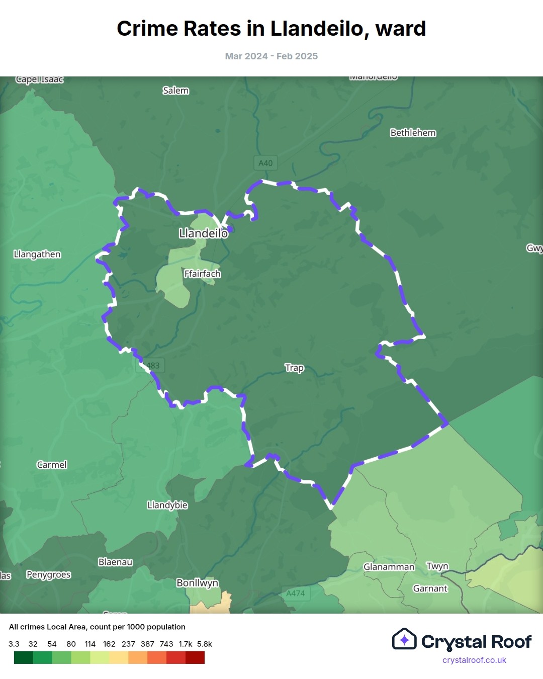 Llandeilo, (ward) includes areas with the following crime ratings (see map):