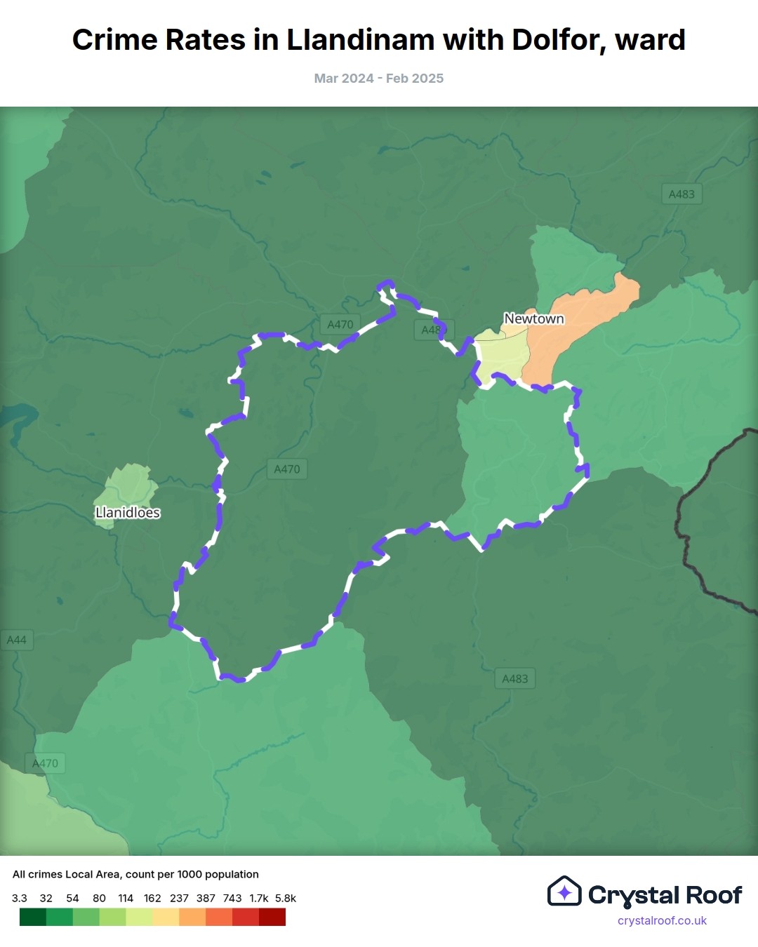Llandinam with Dolfor, (ward) includes areas with the following crime ratings (see map):