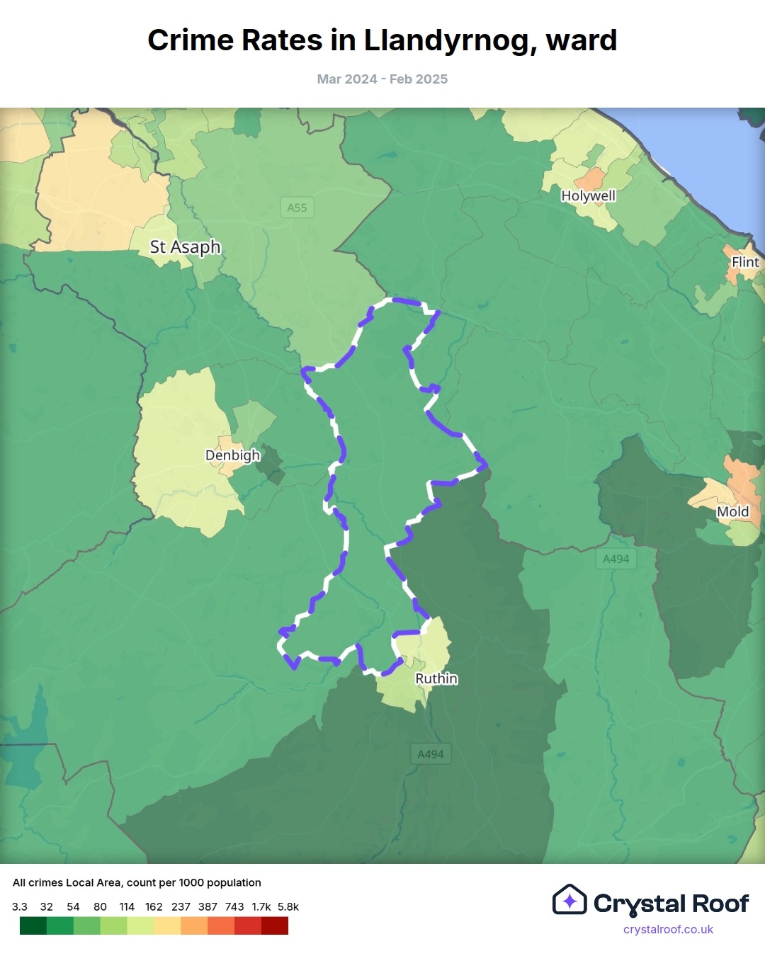 Llandyrnog, (ward) includes areas with the following crime ratings (see map):