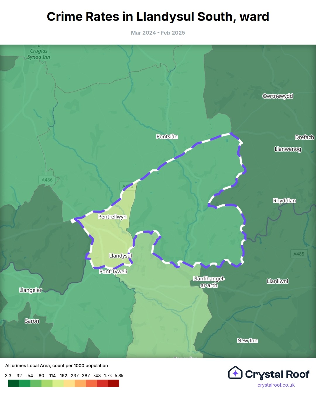 The figures in grey indicate the relative ratings of Llandysul South (ward) for a specific crime type compared to other wards in England and Wales.