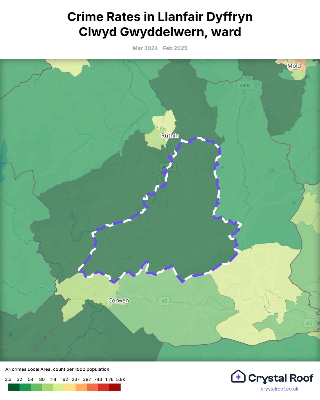 Llanfair Dyffryn Clwyd Gwyddelwern, (ward) includes areas with the following crime ratings (see map):