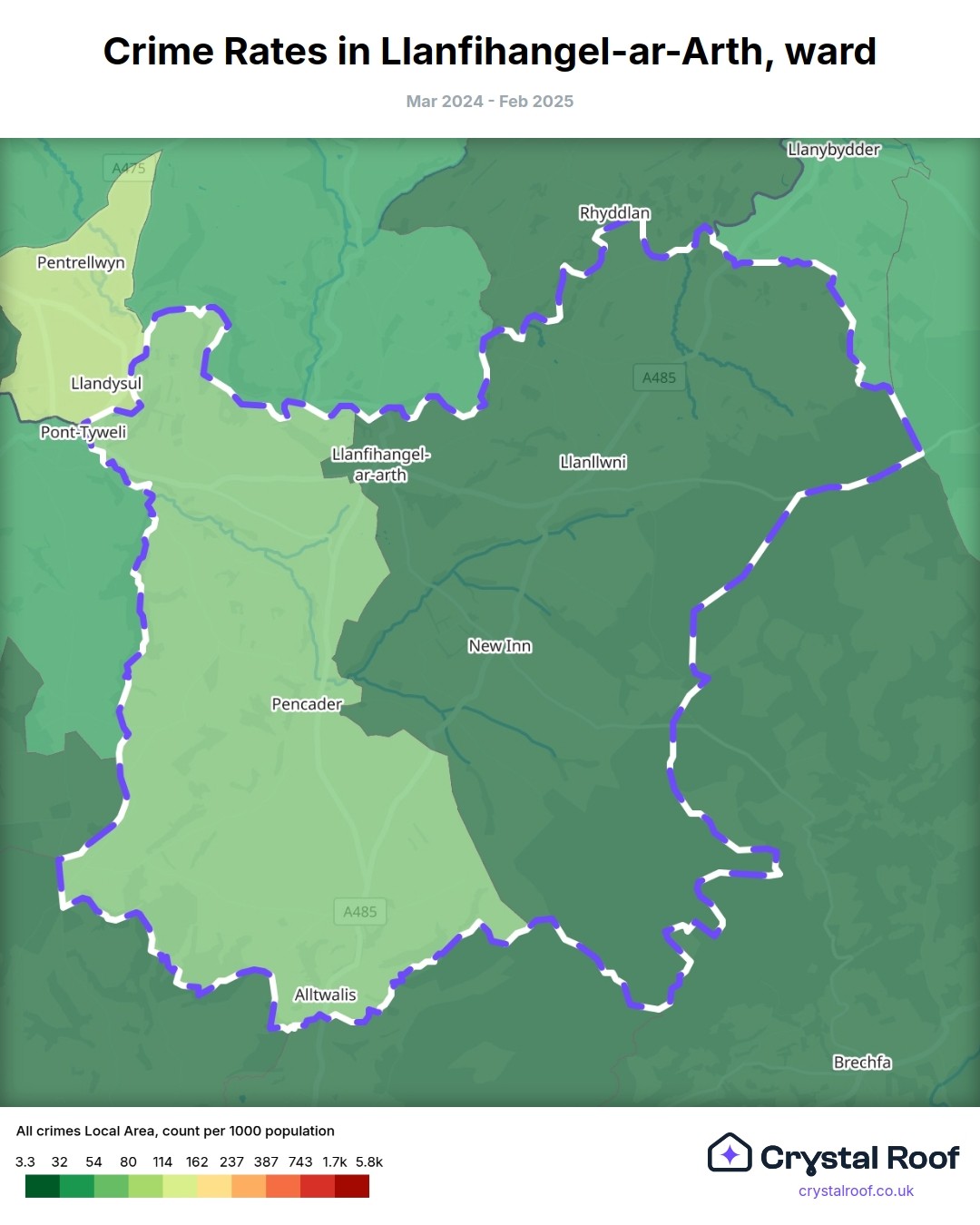 Llanfihangel-ar-Arth, (ward) includes areas with the following crime ratings (see map):
