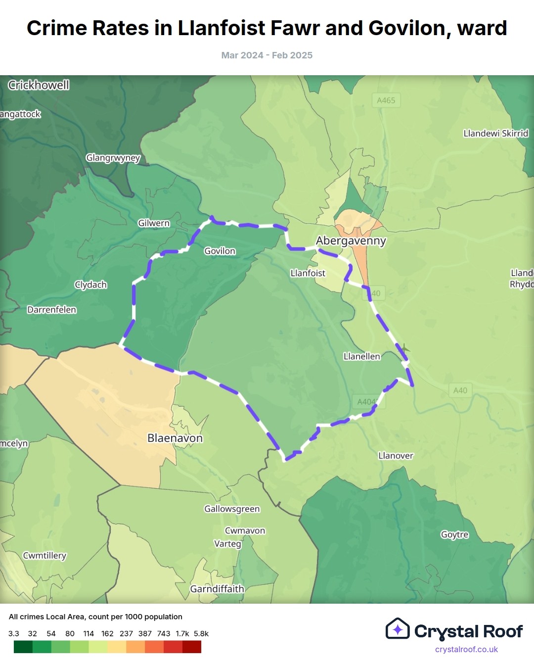 Llanfoist Fawr and Govilon, (ward) includes areas with the following crime ratings (see map):