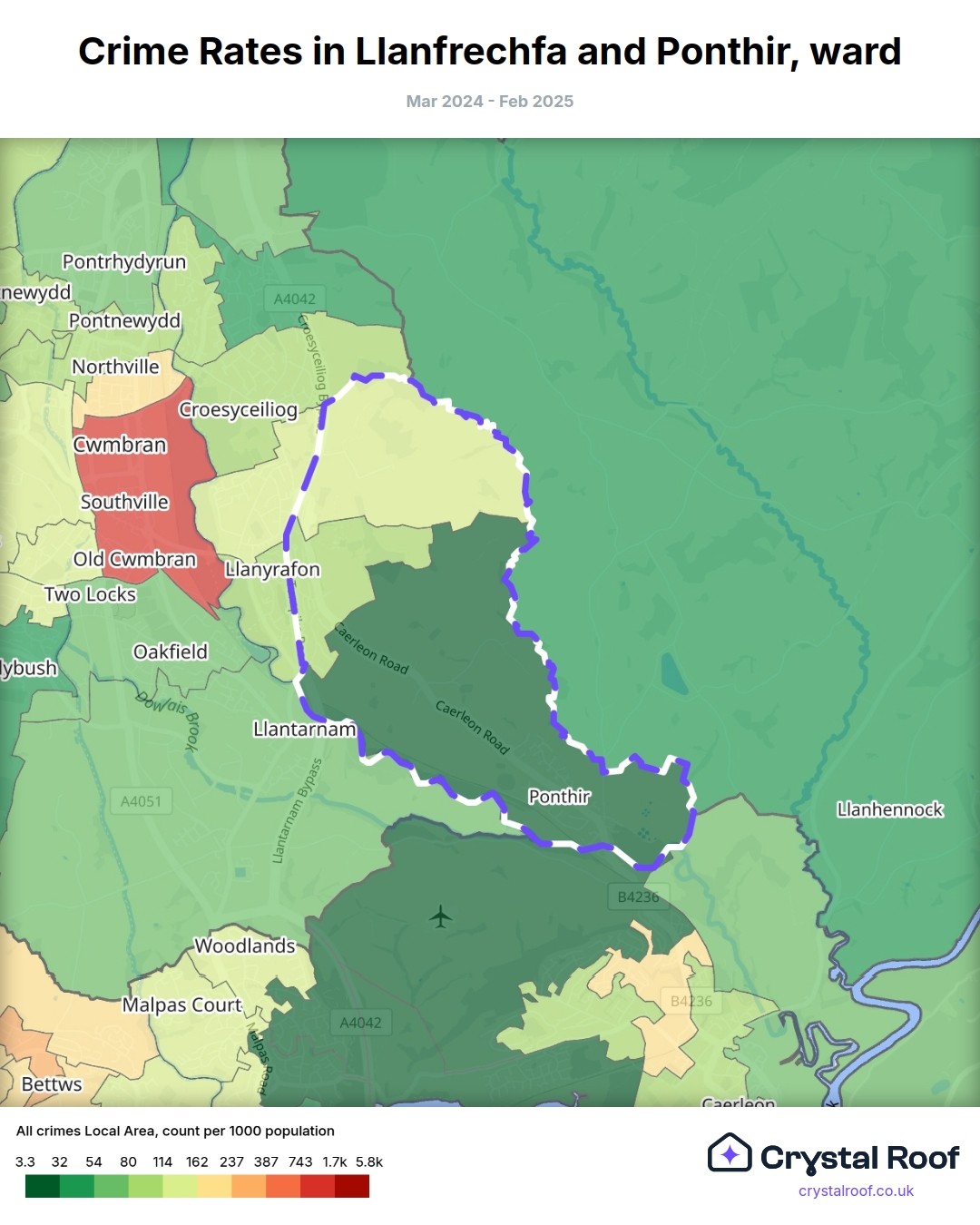 Llanfrechfa and Ponthir, (ward) includes areas with the following crime ratings (see map):