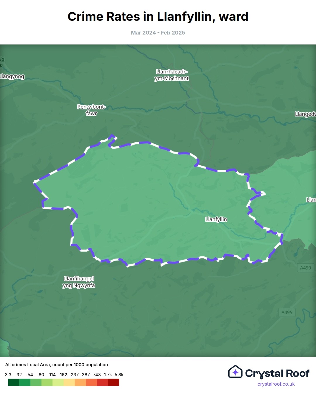 Llanfyllin, (ward) includes areas with the following crime ratings (see map):