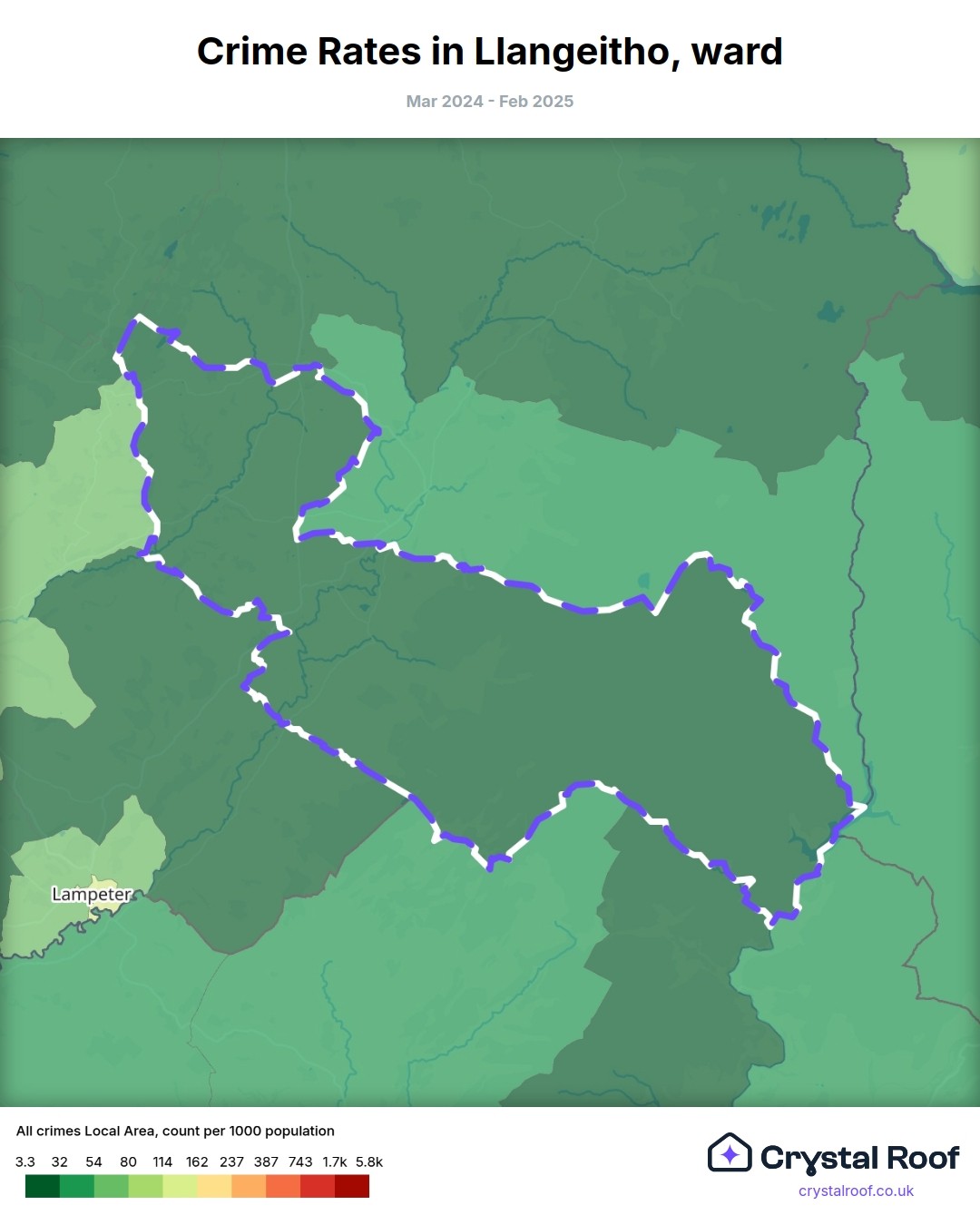 Llangeitho, (ward) includes areas with the following crime ratings (see map):