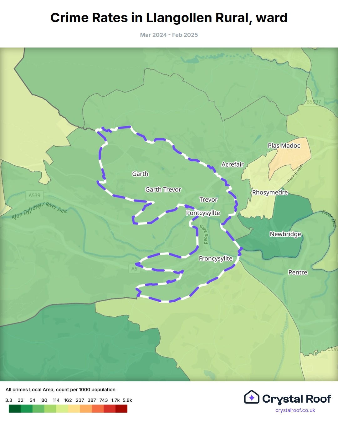 Llangollen Rural, (ward) includes areas with the following crime ratings (see map):