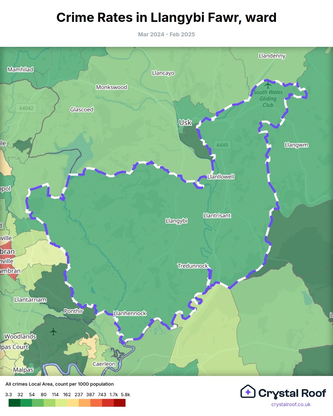The figures in grey indicate the relative ratings of Llangybi Fawr (ward) for a specific crime type compared to other wards in England and Wales.