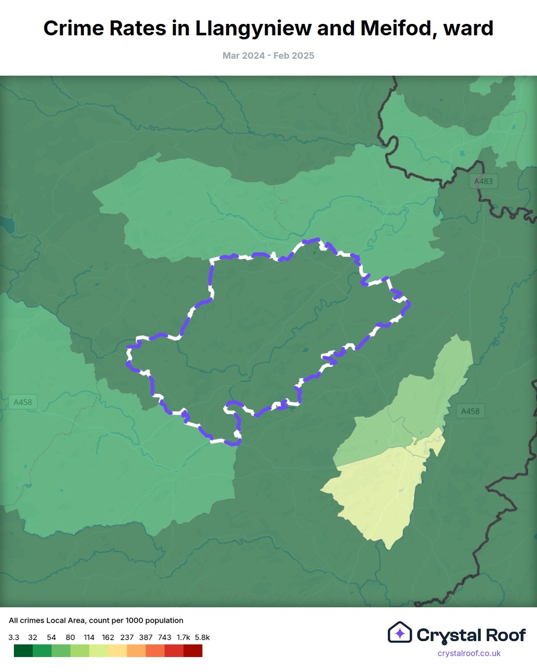 Llangyniew and Meifod, (ward) includes areas with the following crime ratings (see map):