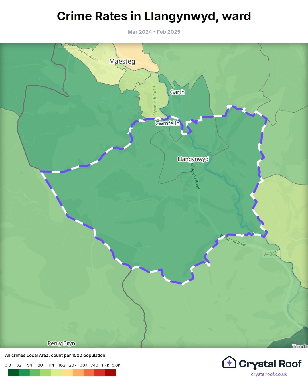 Llangynwyd, (ward) includes areas with the following crime ratings (see map):