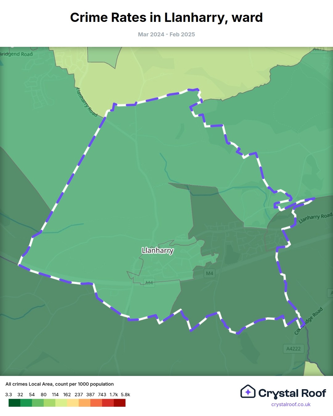 Llanharry, (ward) includes areas with the following crime ratings (see map):