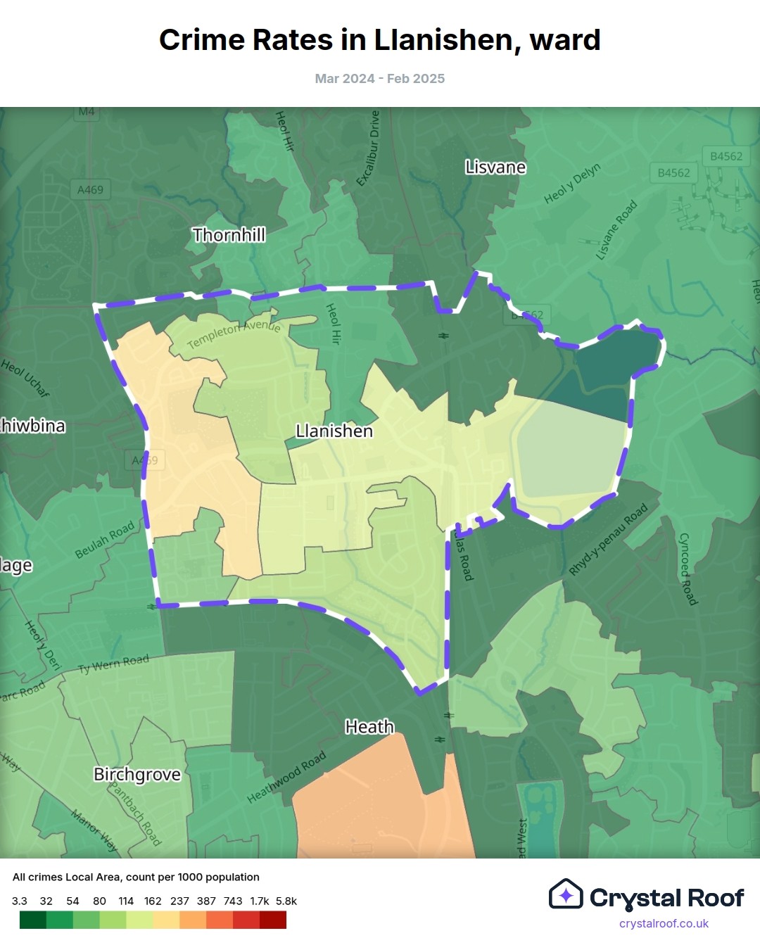 Llanishen, (ward) includes areas with the following crime ratings (see map):