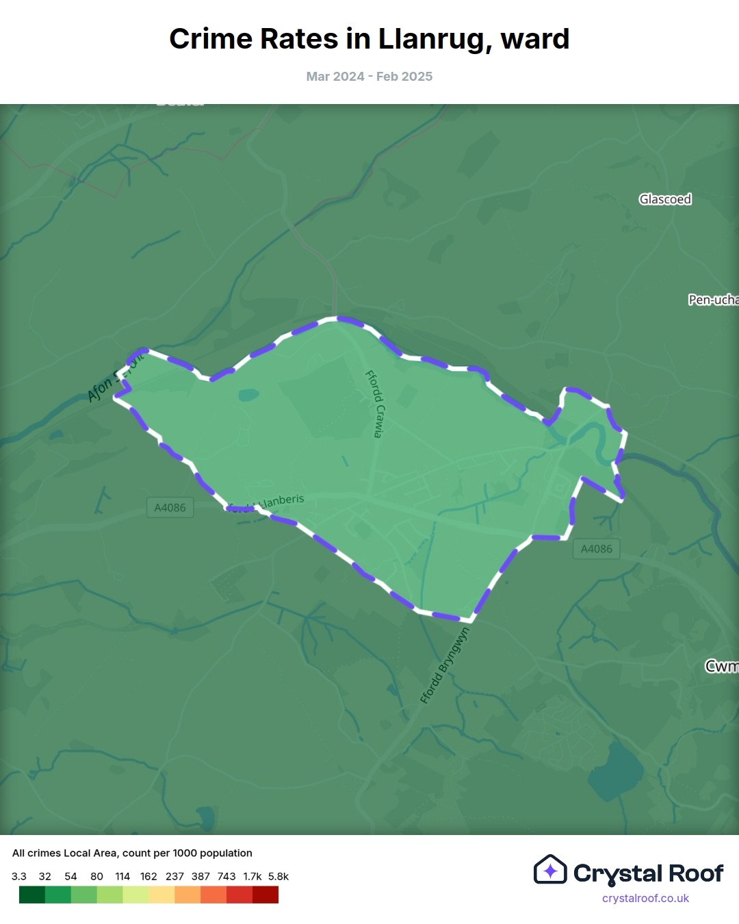 The figures in grey indicate the relative ratings of Llanrug (ward) for a specific crime type compared to other wards in England and Wales.