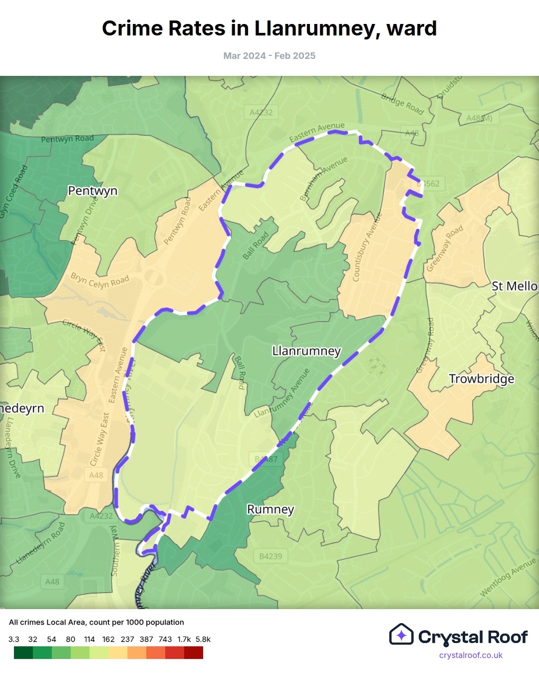 Llanrumney, (ward) includes areas with the following crime ratings (see map):