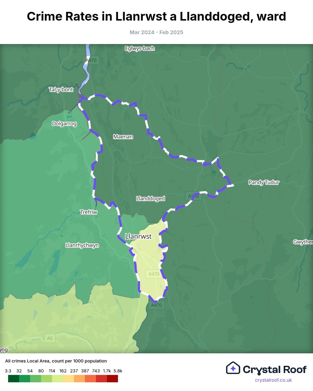 Llanrwst a Llanddoged, (ward) includes areas with the following crime ratings (see map):