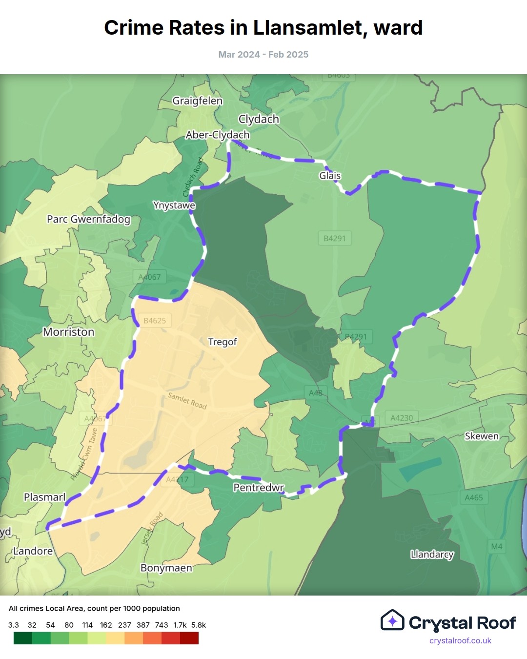 Llansamlet, (ward) includes areas with the following crime ratings (see map):