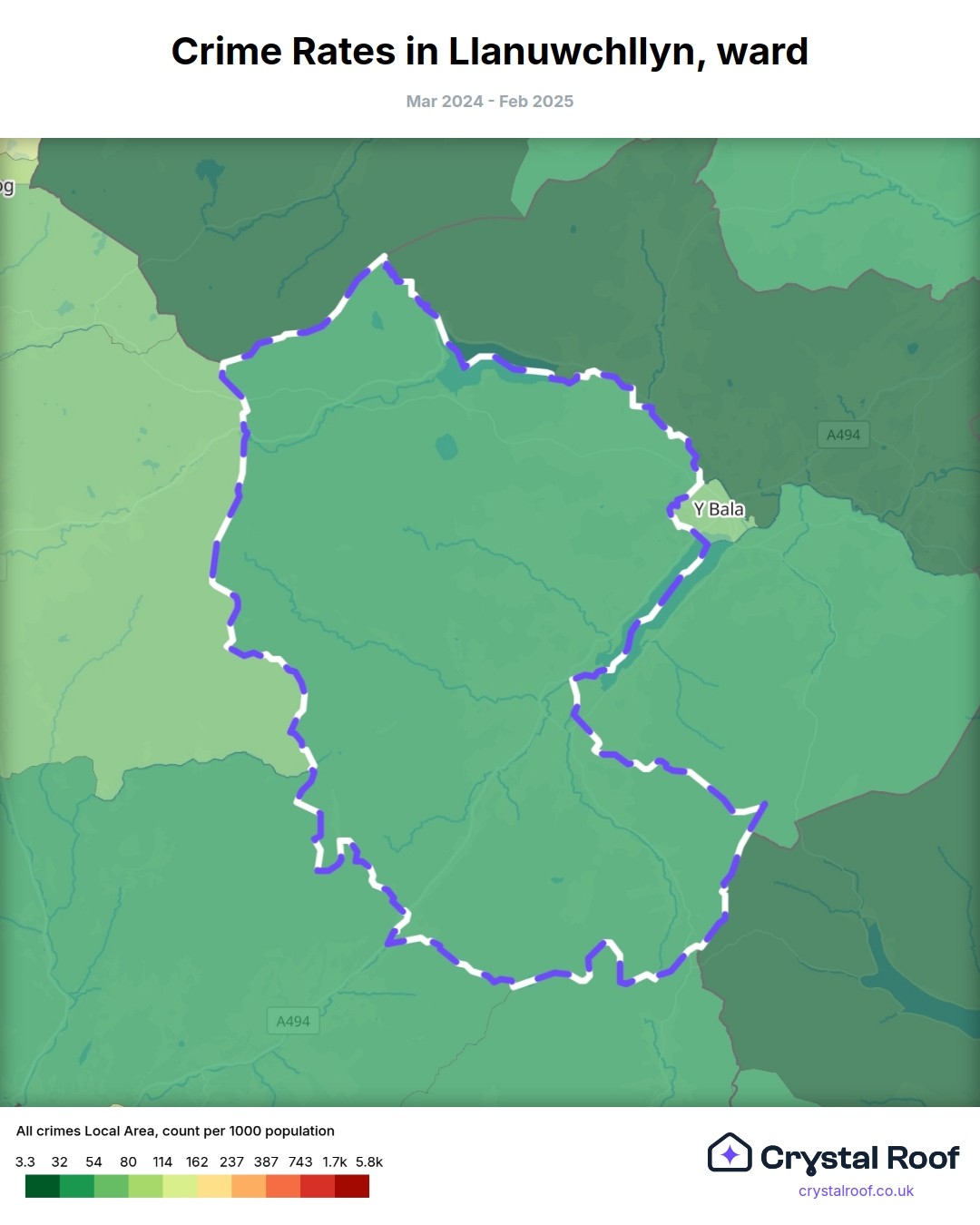 Llanuwchllyn, (ward) includes areas with the following crime ratings (see map):