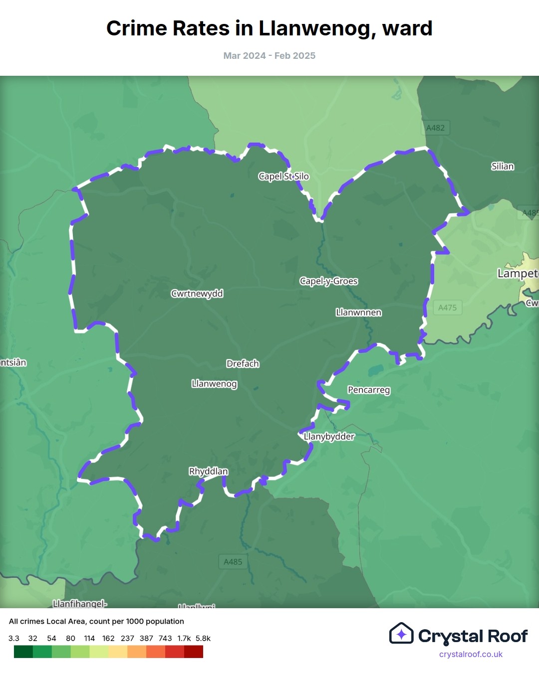 Llanwenog, (ward) includes areas with the following crime ratings (see map):
