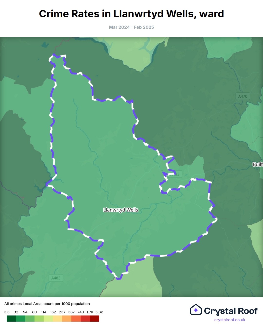 Llanwrtyd Wells, (ward) includes areas with the following crime ratings (see map):