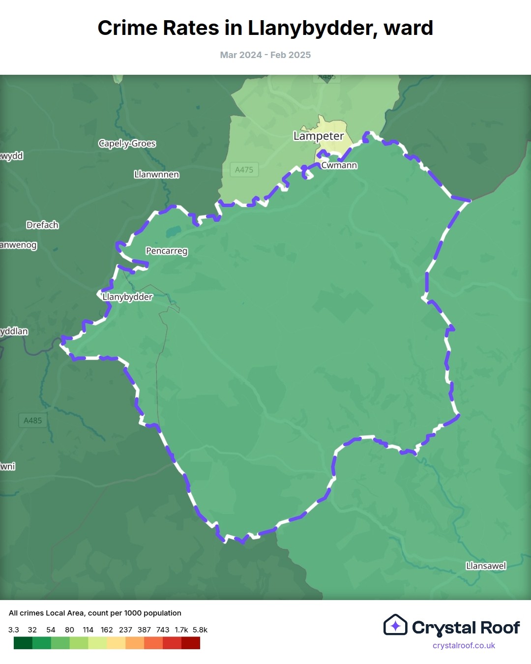 Llanybydder, (ward) includes areas with the following crime ratings (see map):