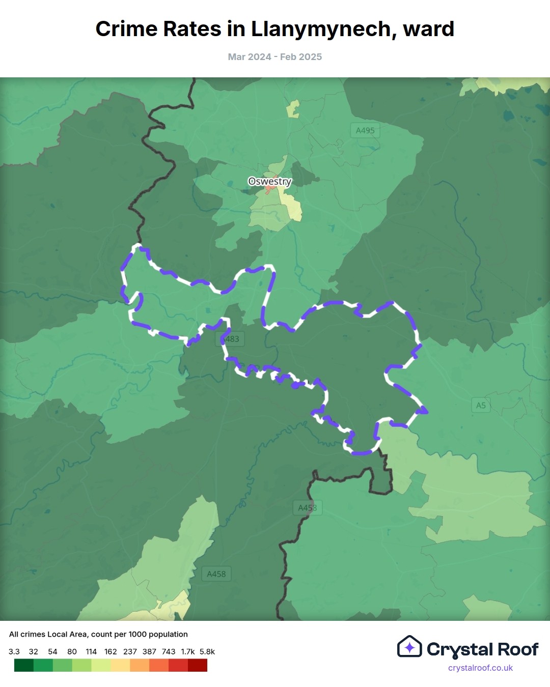 Llanymynech, (ward) includes areas with the following crime ratings (see map):