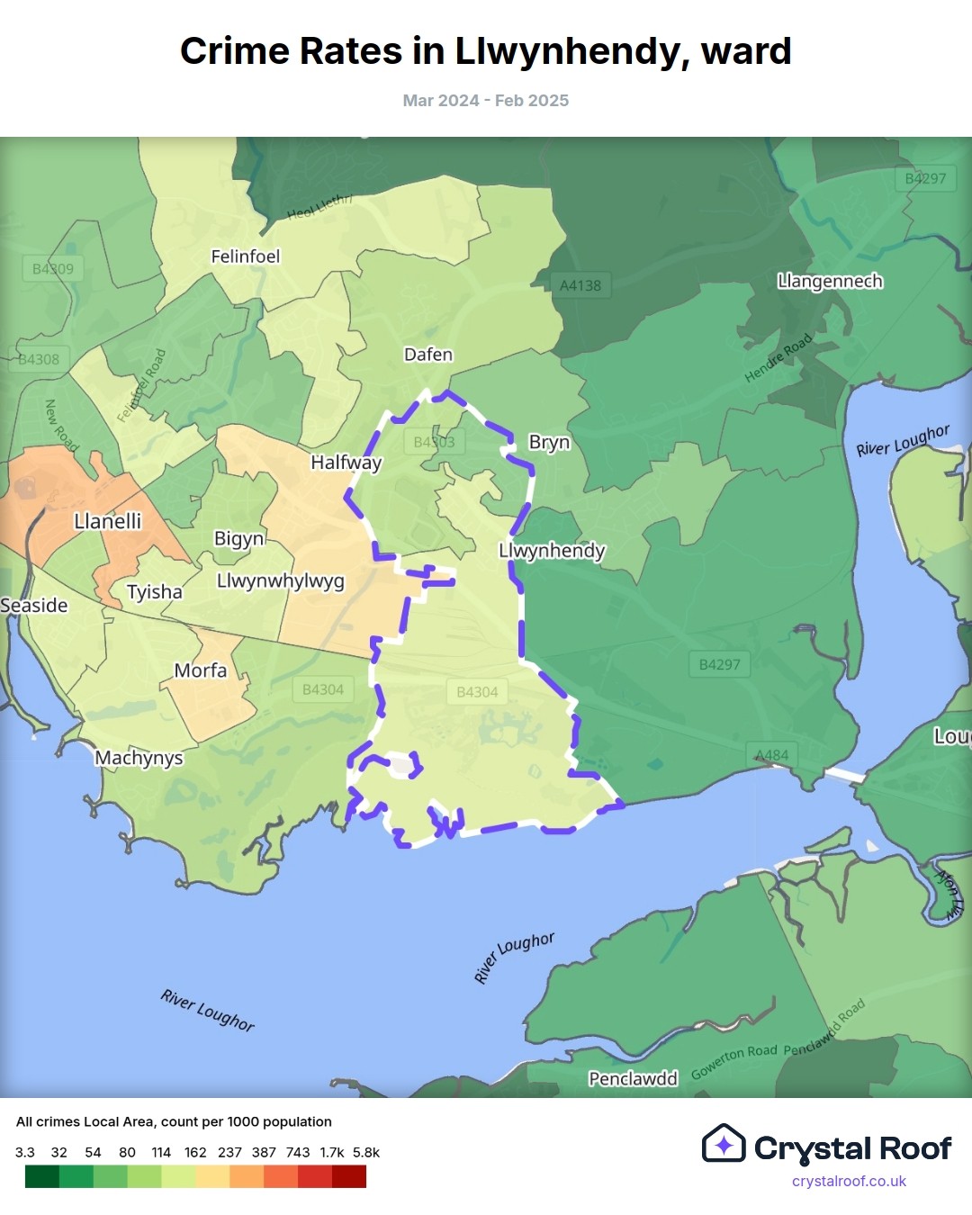 Llwynhendy, (ward) includes areas with the following crime ratings (see map):