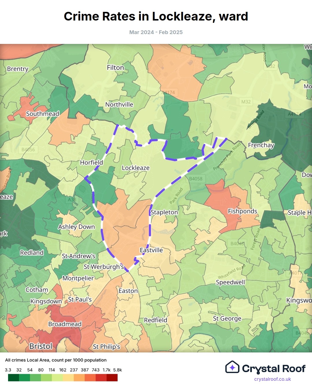 Lockleaze (ward) is located within Bristol, City of (borough). Annual total crime rate in Bristol, City of (borough) is 142 crimes per thousand resident population, which can be rated as 7 out of 10 or high crime level compared to other local authority districts in England and Wales.