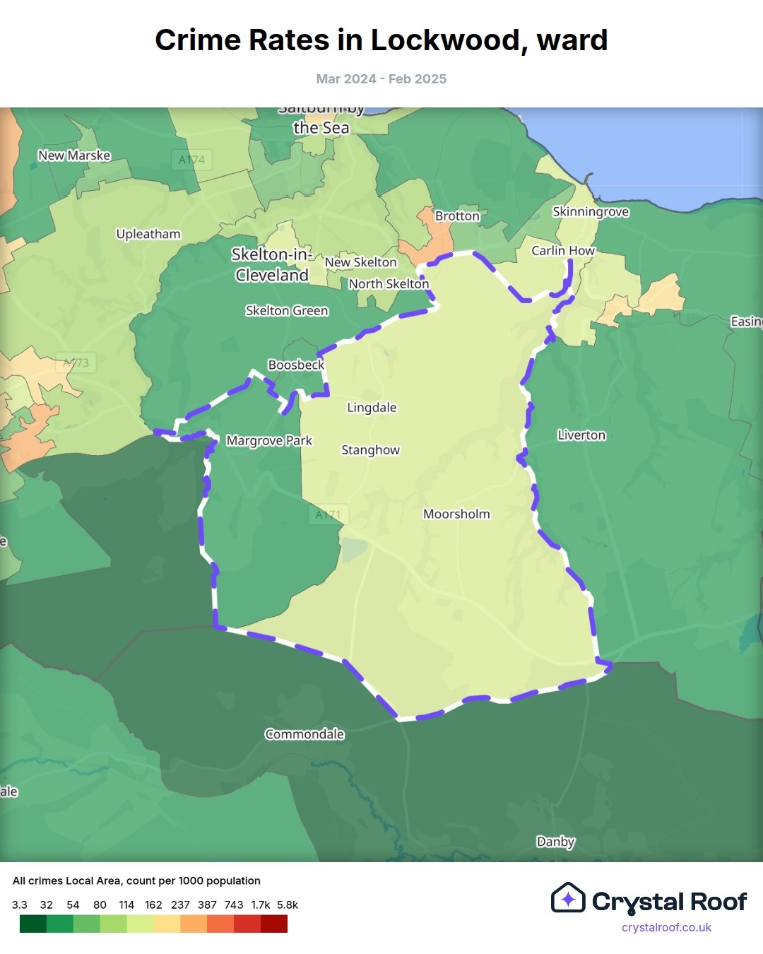 Lockwood (ward) is located within Redcar and Cleveland (borough). Annual total crime rate in Redcar and Cleveland (borough) is 139 crimes per thousand resident population, which can be rated as 7 out of 10 or high crime level compared to other local authority districts in England and Wales.