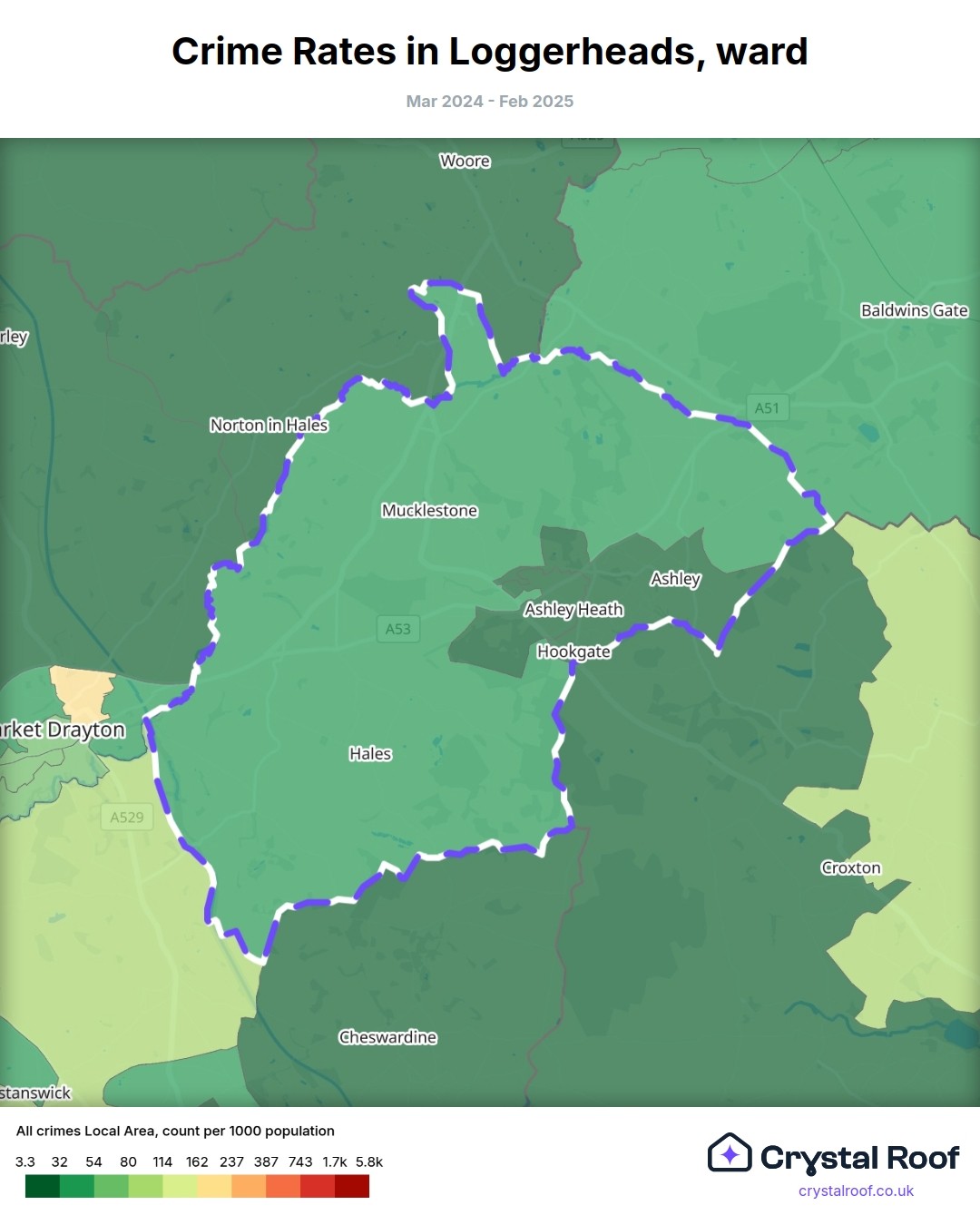 Loggerheads, (ward) includes areas with the following crime ratings (see map):