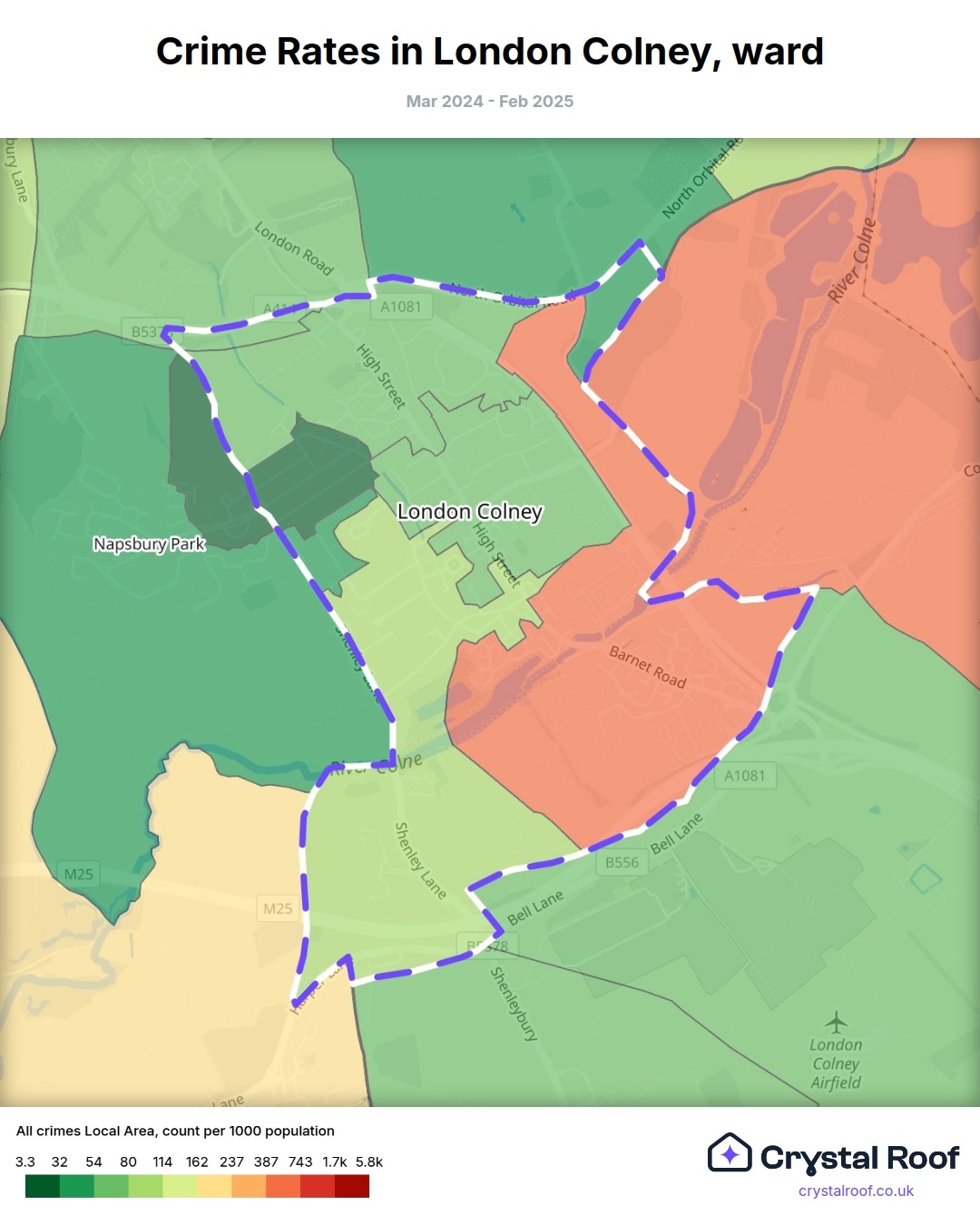 The figures in grey indicate the relative ratings of London Colney (ward) for a specific crime type compared to other wards in England and Wales.