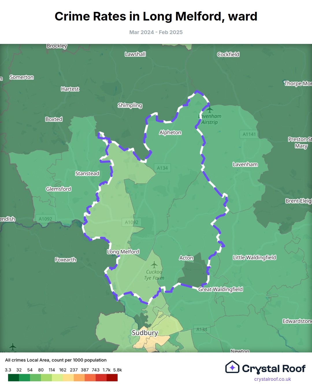 Long Melford, (ward) includes areas with the following crime ratings (see map):