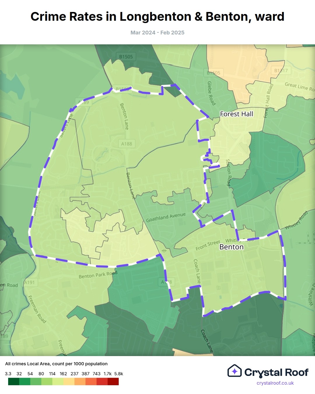 Longbenton & Benton, (ward) includes areas with the following crime ratings (see map):