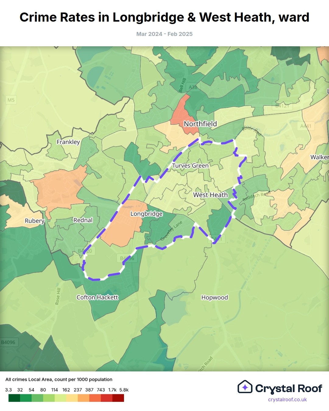 Longbridge & West Heath, (ward) includes areas with the following crime ratings (see map):