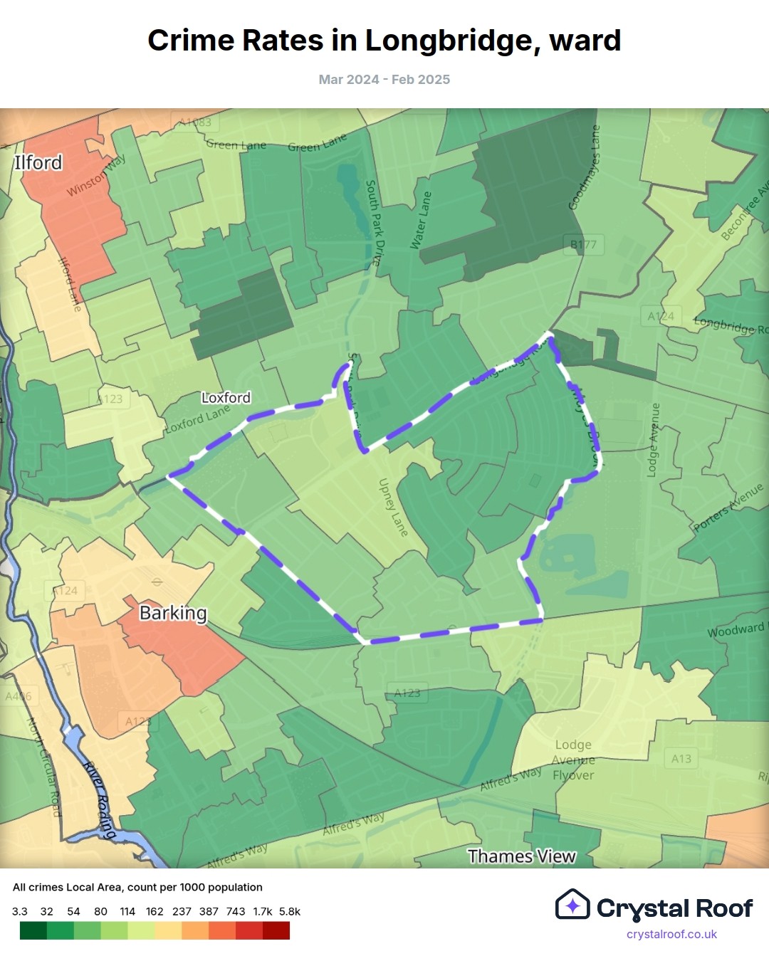 Longbridge (ward) is located within Barking and Dagenham (borough). Annual total crime rate in Barking and Dagenham (borough) is 111 crimes per thousand resident population, which can be rated as 5 out of 10 or medium crime level compared to other local authority districts in England and Wales.